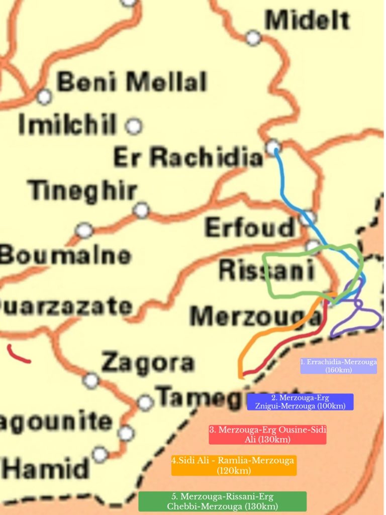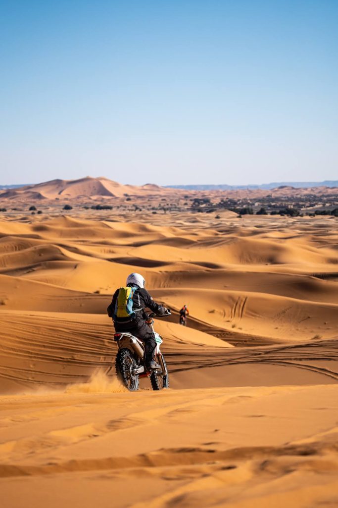 Eine Enduro-Tour, konzipiert für alle Offroad-Fahrer, die das echte Marokko und seine majestätischen Sanddünen entdecken möchten. Jede Tour kann entsprechend den Fähigkeiten und Vorlieben der Gruppe angepasst werden — vorausgesetzt, die Gruppe ist homogen! Ausrüstung kann für Enduro-Motorräder, Buggys, Quads, 4×4-Fahrzeuge, E-Bikes, Kamele bereitgestellt werden, und luxuriöse Unterkünfte im Wüstencamp sind verfügbar.